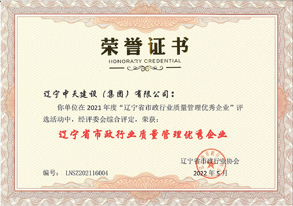 企業先后榮獲“全國優秀施工企業”、 “中國AAA級信用企業”、“全國保障性安居工程建設勞動競賽先進單位”、“遼寧省最受尊敬企業”、“遼寧省優秀建筑業企業”、“遼寧省工程建設質量管理優秀企業”、 “遼寧省守合同、重信用企業”、遼寧省“AAA級信用企業”、 “撫順市安全生產先進單位、紅旗單位”、“撫順市安康杯競賽先進集體”等多項殊榮。